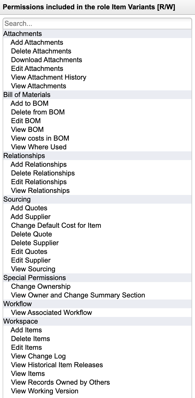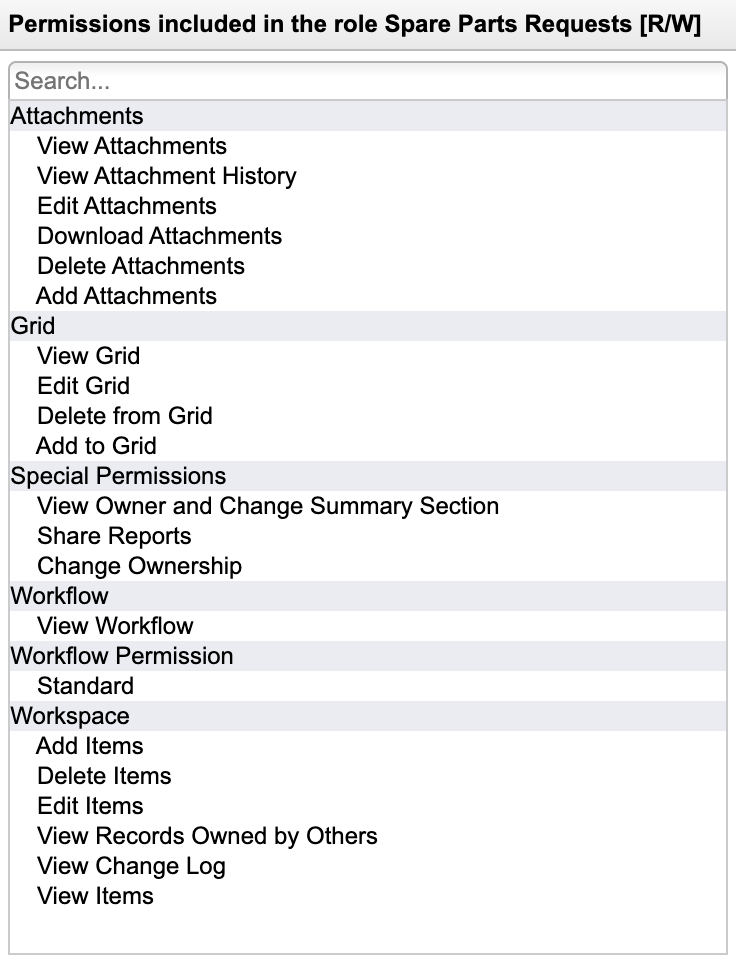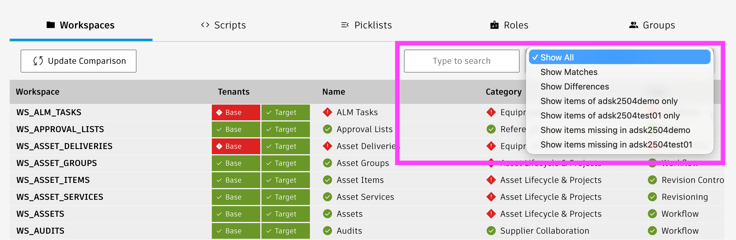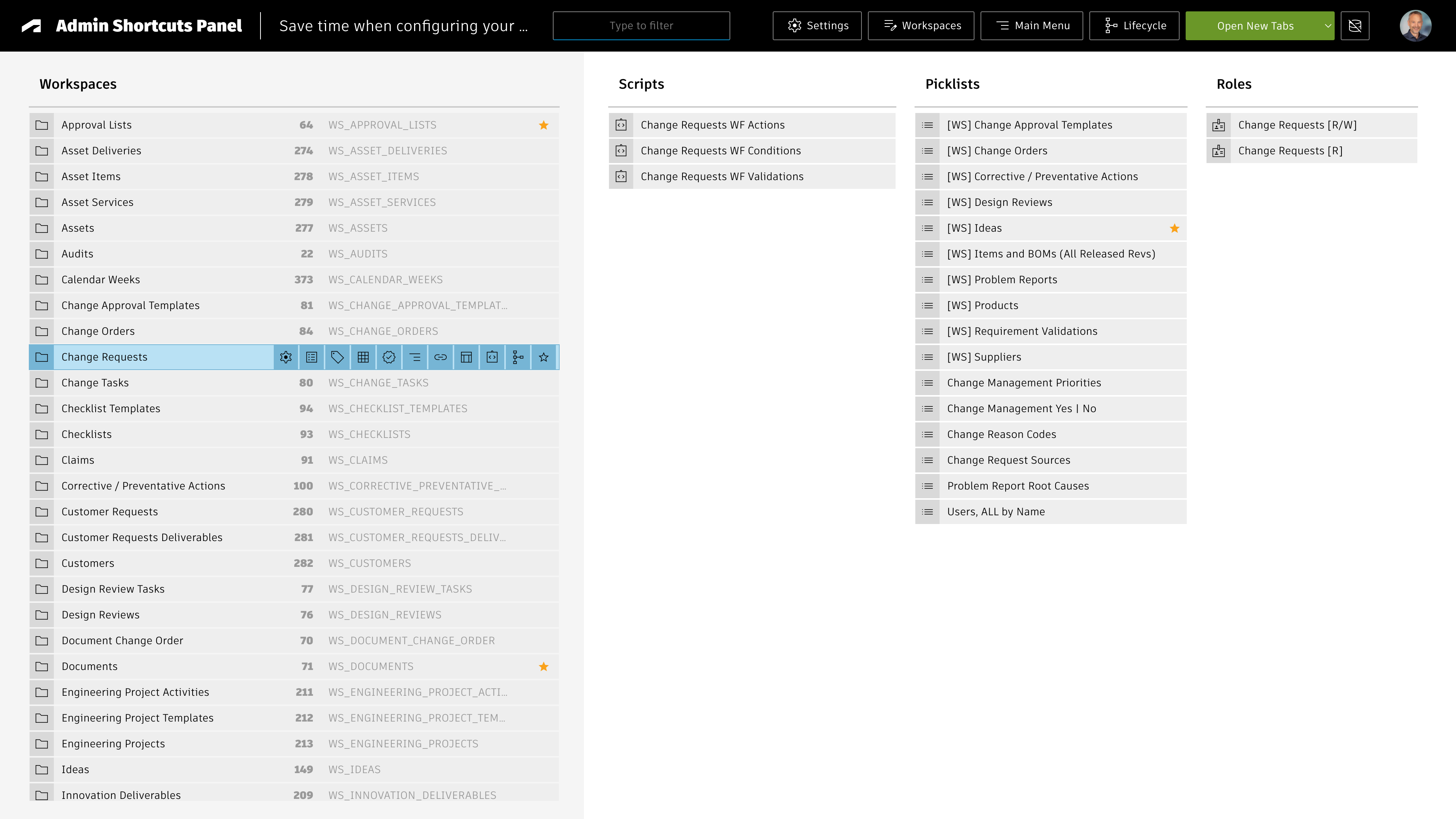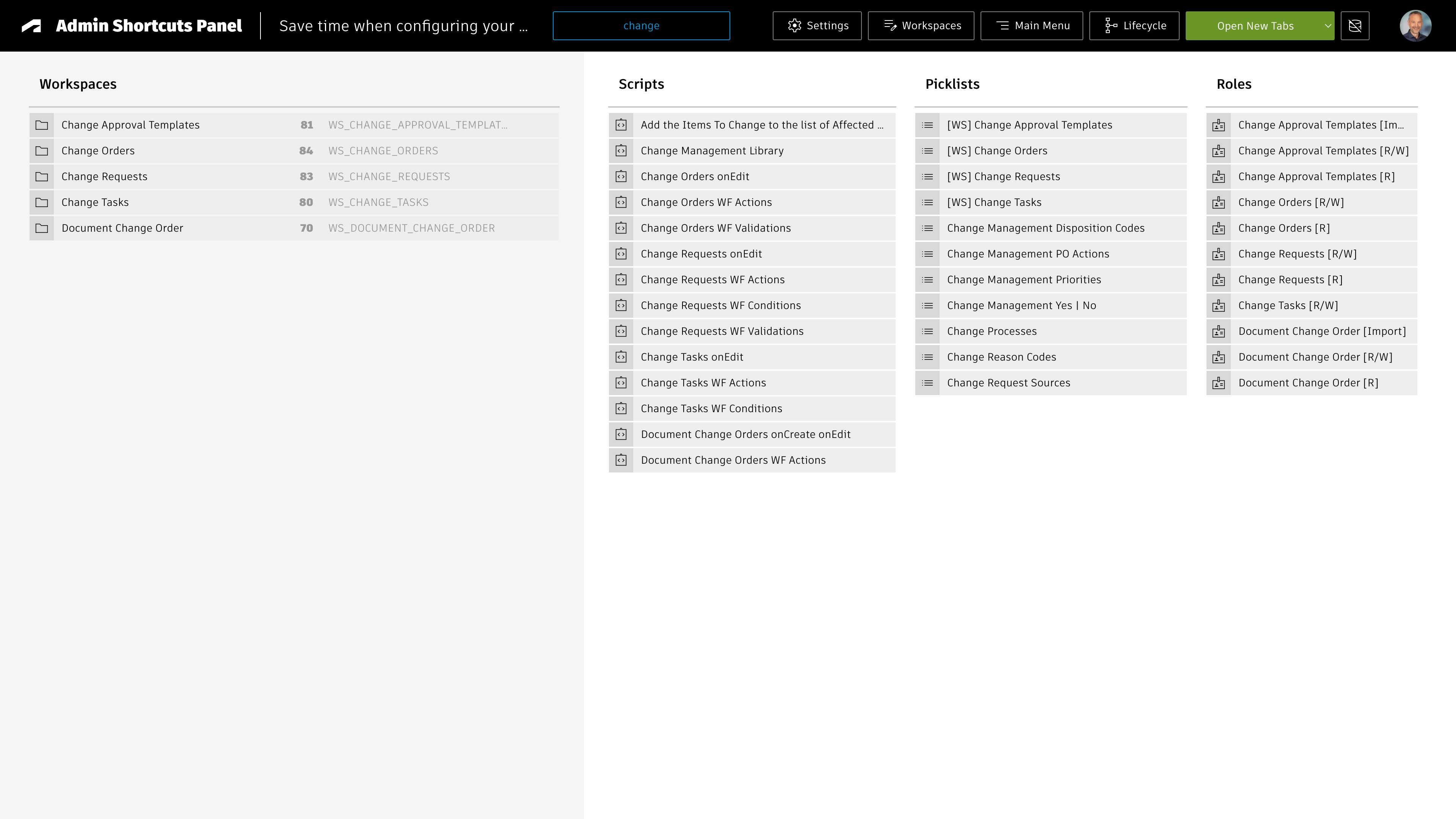 Users can filter all the lists in this panel using the search input in the global header toolbar. This helps locating all worksapces, scripts, picklists and roles that belong together, for example everything that relates to 'Change'.