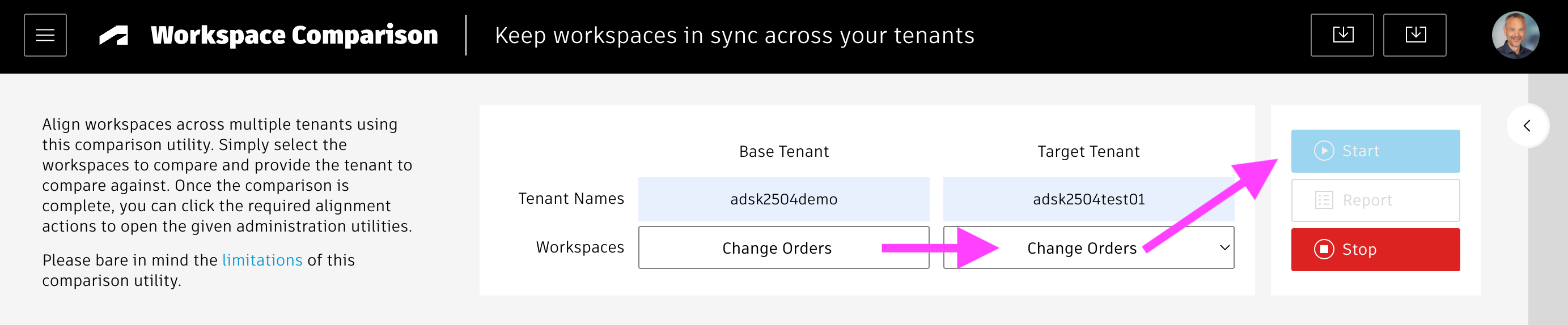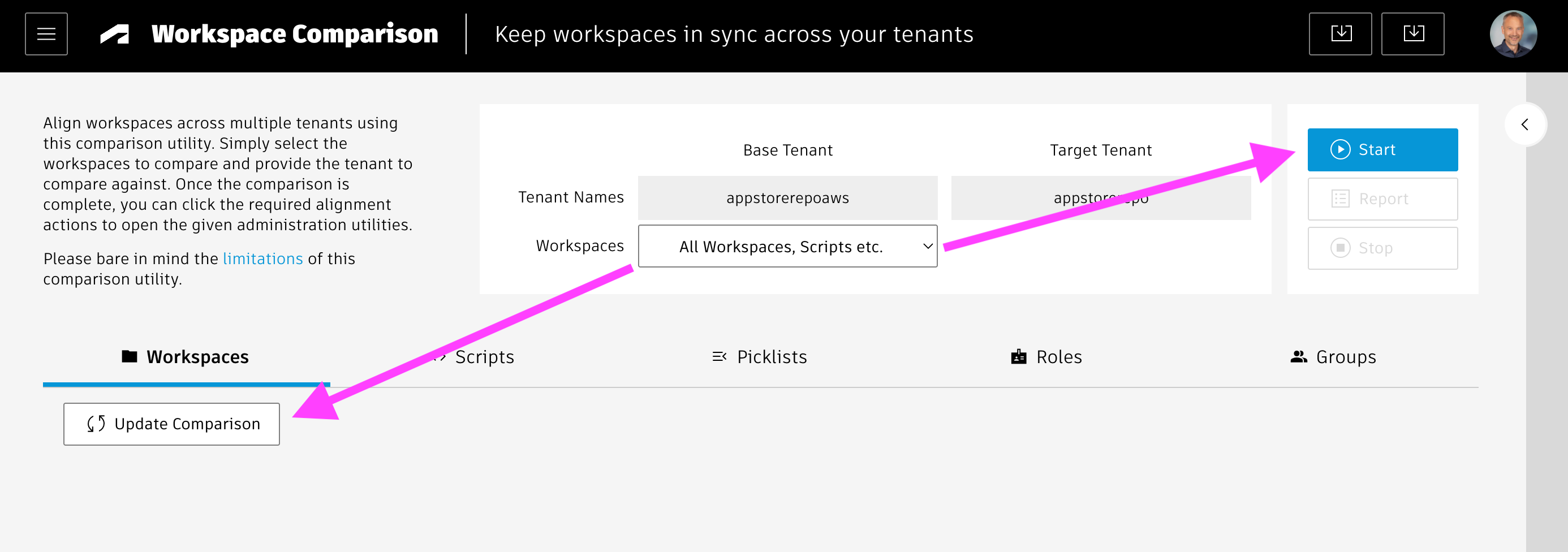 - start can be set to true in order to let the comparison start once the initial workspace list has been loaded for both the source and target tenant.