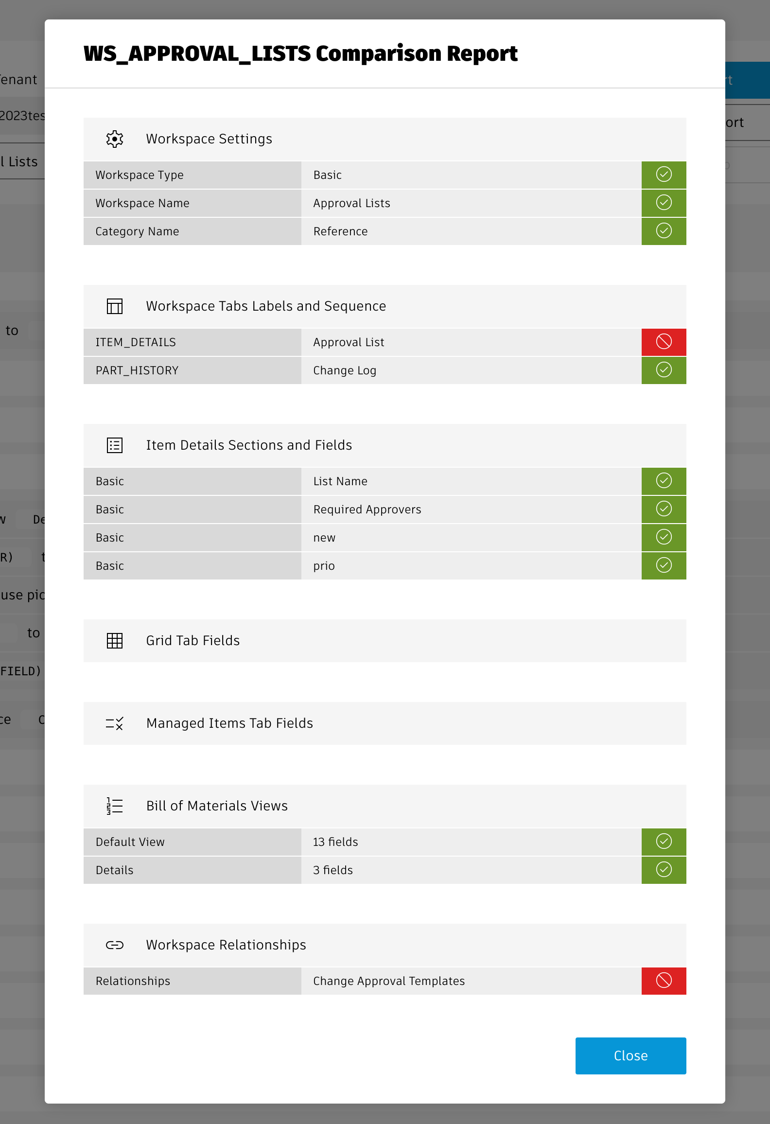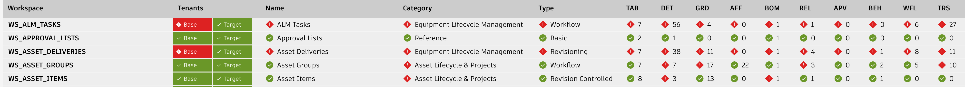 Each tab (Workspaces, Scripts, Picklists ...) indicates if the given elements exist in both or only one of the defined tenants in column Tenants. In all tabs (except the Workspaces tab), you can click the green elements of column Tenants to open the given admin utility. However, in the Workspaces tab, you can instead click the counters in columns TAB, DET etc to open the given workspace manager utility of both tenants side by side.