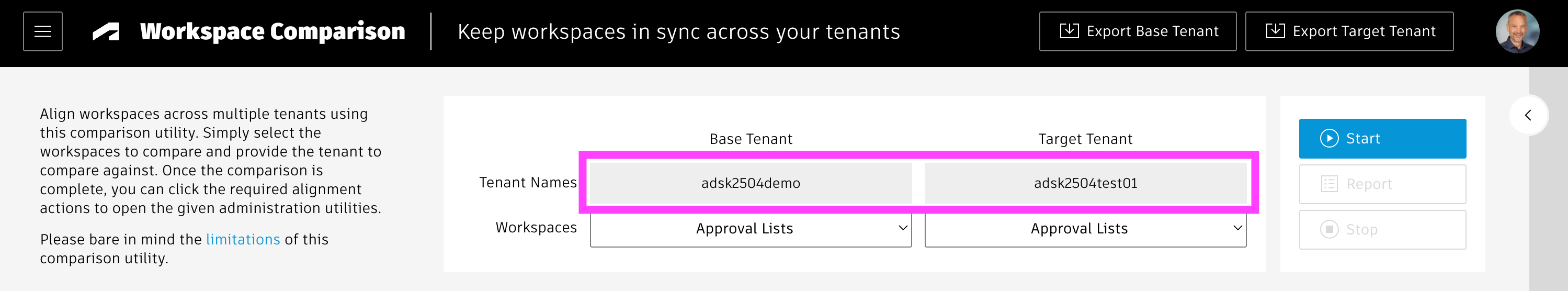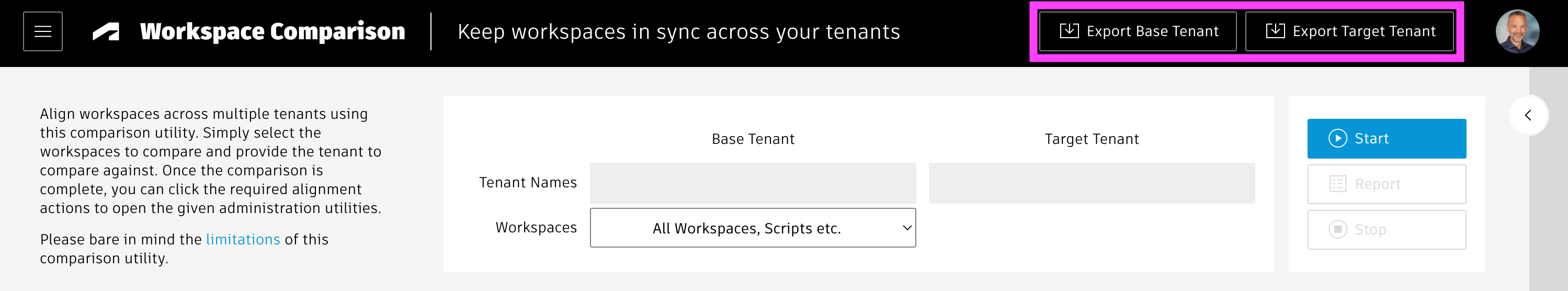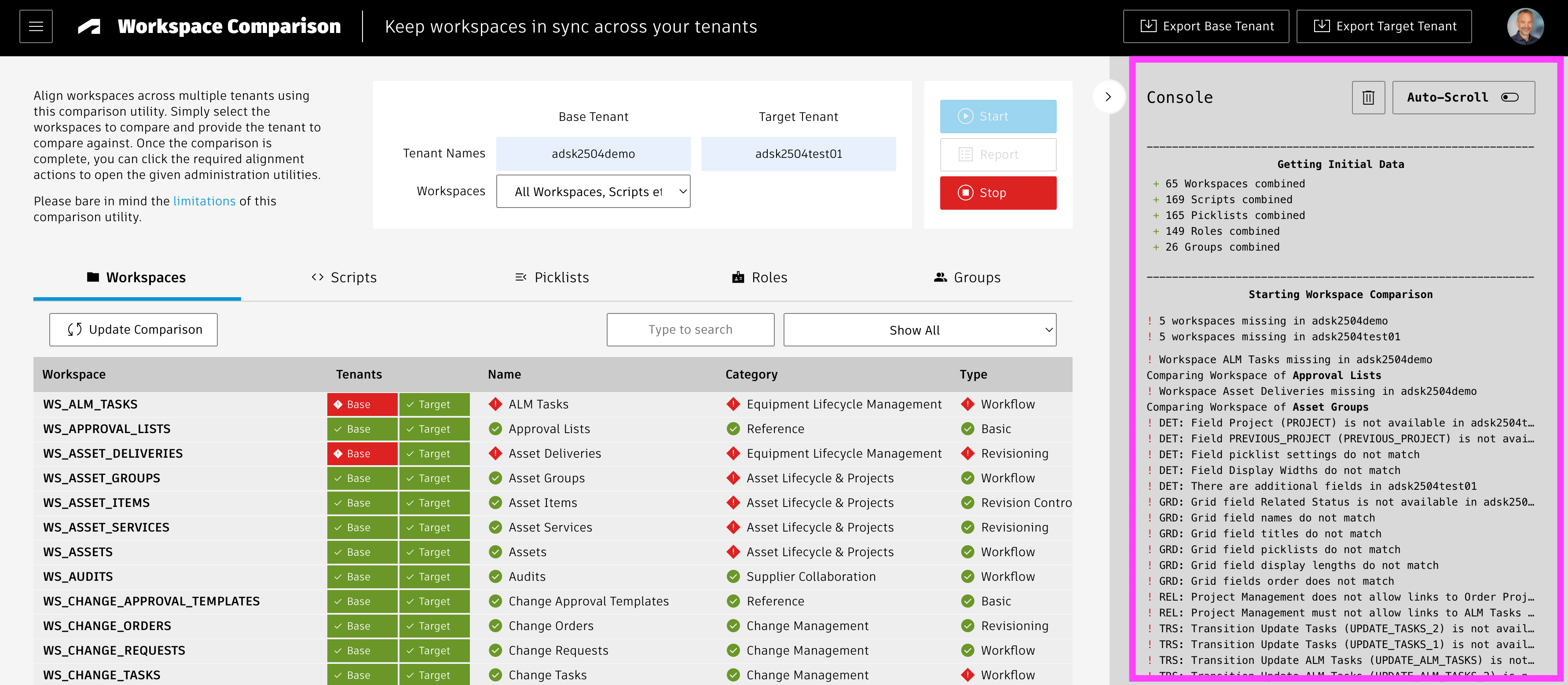 In order to launch the detaile workspace based comparion, simply select the workspaces to compare in each tenant's workspaces drop donw. As you select a workspace in the Base Tenant, the utility will automatically unhide the workspaces list of the target tenant and select the matching entry if available. You can always return to mode #1 and its results by selecting the first entry of the base tenant's workspaces list named All Workspaces, Scripts, etc. You can run the comparison by clicking the blue Start button. Once the comparison is running, you can click the Stop button to end the process whenever needed.