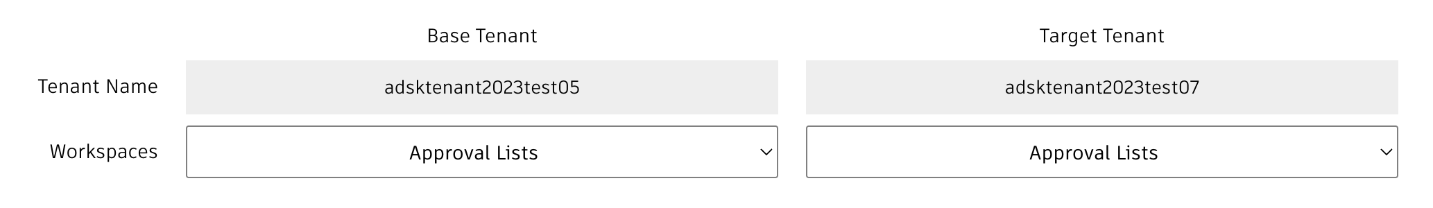 In order to launch the comparison, the names of two tenants must be defined on top. The tenant which the UX Extensions server is connected to will be considered as Base Tenant automatically while the second tenant must be typed in. You can also use the same tenant name for both the Base and Target in order to compare two different workspaces within the same tenant. Once you press enter in teh tenant inputs fields, the given list of Workspaces below will be refreshed.